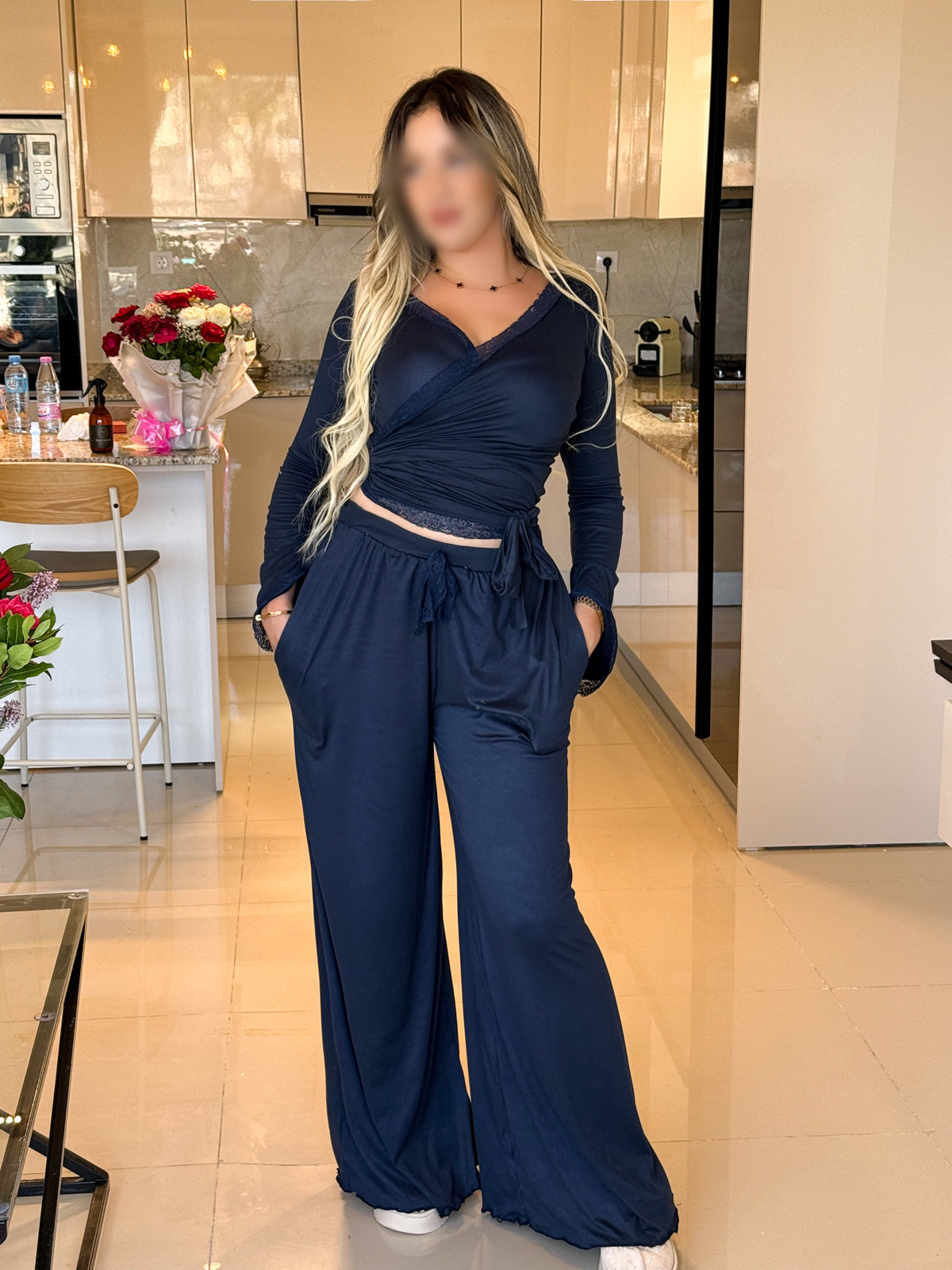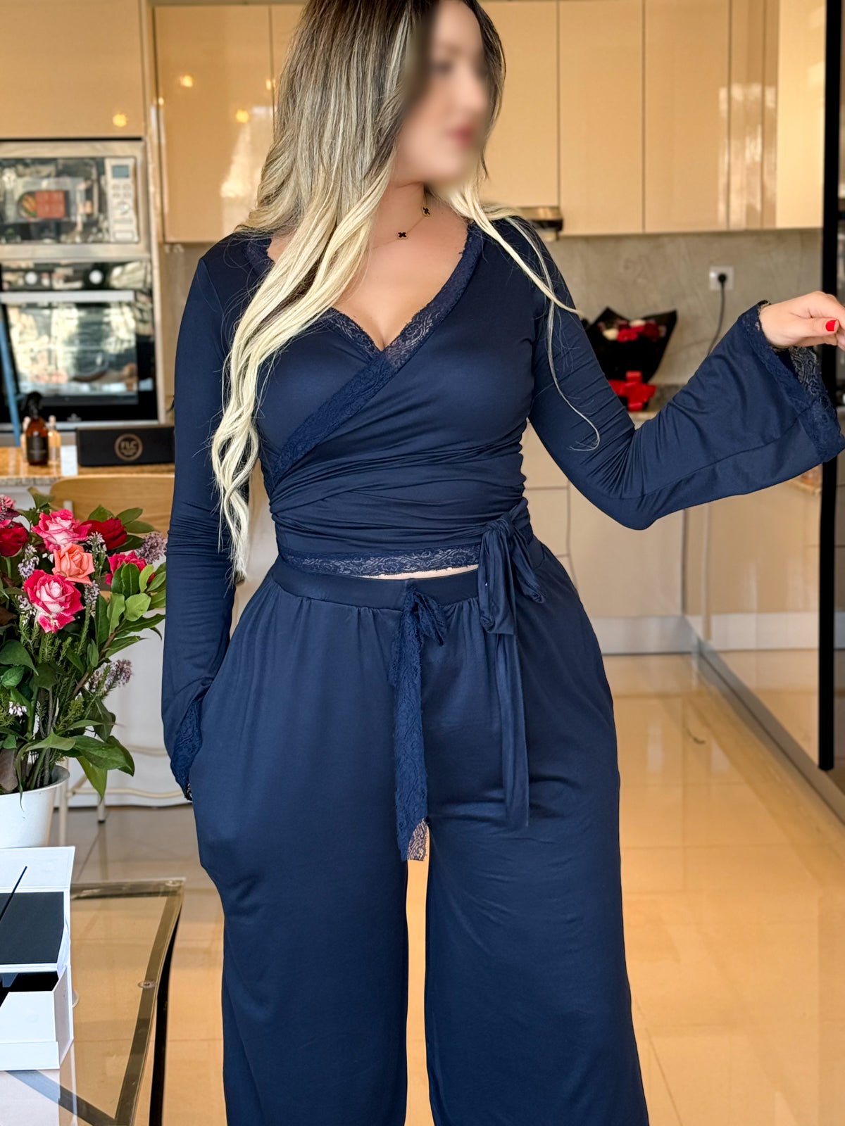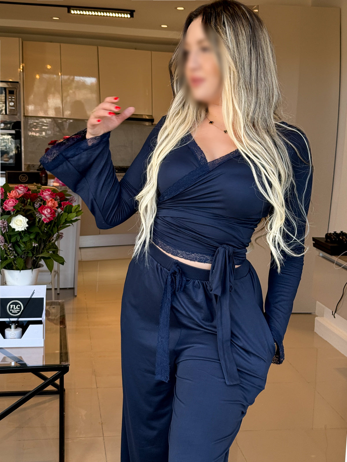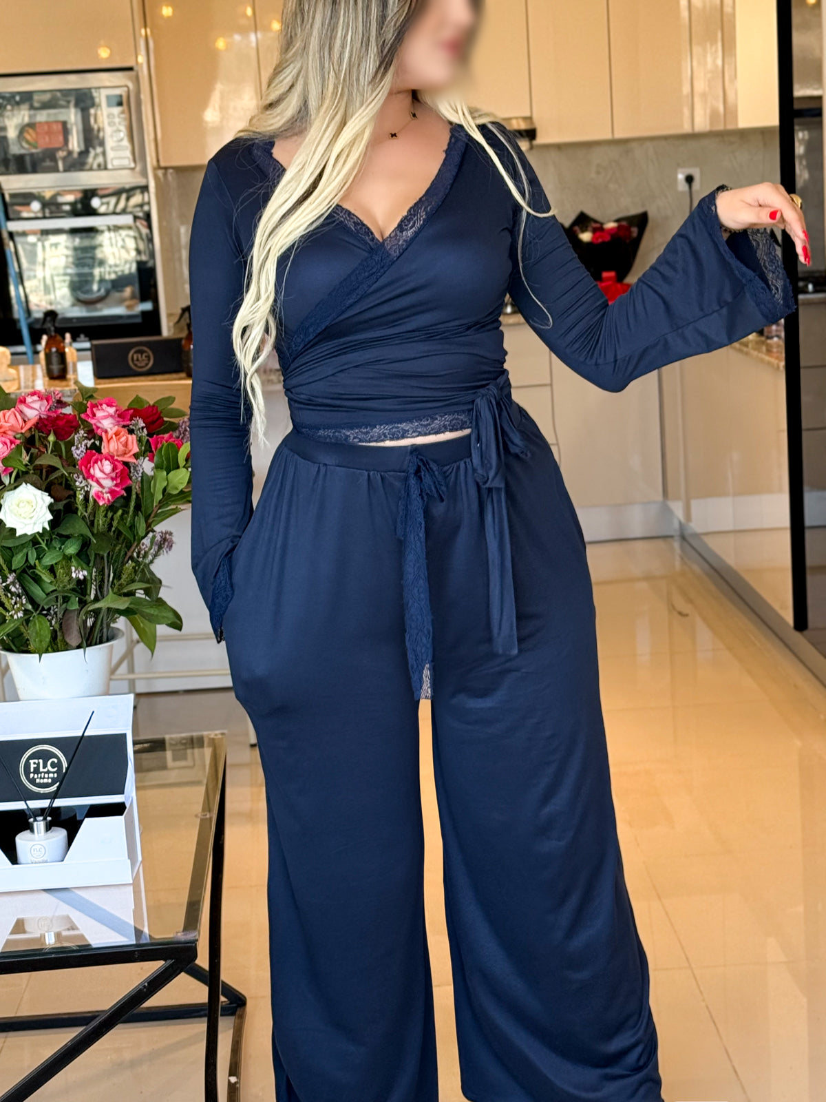 Ensemble Pilâtes manche long dentelle bleu nuit VIOLITA